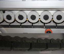 КОНВЕЙЕР · Долговечная и надежная конструкция конвейера. · Точное перемещение башмаков осуществляется за счет полукруглой направляющей прошедшую специальную термообработку с помощью цепи. · Износостойкие башмаки в сочетании с резиновыми прижимными роликами O 60 мм расположенными в 2 ряда обеспечивают точную транспортировку заготовок. · Стабильная работа транспортировочного двигателя обеспечивается за счет плавного пуска и эклектического тормоза, в целях безопасности при аварийной остановке.