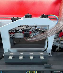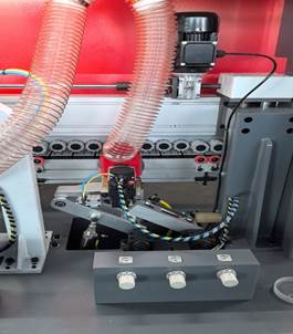 ПРЕСС ГРУППА · Состоит из одного подающего ролика большого диаметра O 100 мм и трех до прессовочных O 65 мм роликов обеспечивая надежную фиксацию кромочного материала на торец заготовки. · Регулировка площадки прижимной группы на толщину кромочного материала осуществляется с помощью цифрового счетчика. · Каждый ролик оснащен индивидуальным пневмоцилиндром. · Прижимные ролики подходят для прижатия кромочного материала различной толщины на торец заготовки для минимизации клеевого шва. |